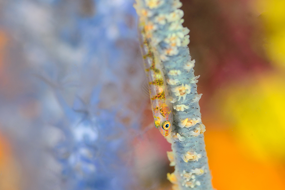井田でも一番多く観察出来るオレンジ色のムチヤギに付くガラスハゼ。