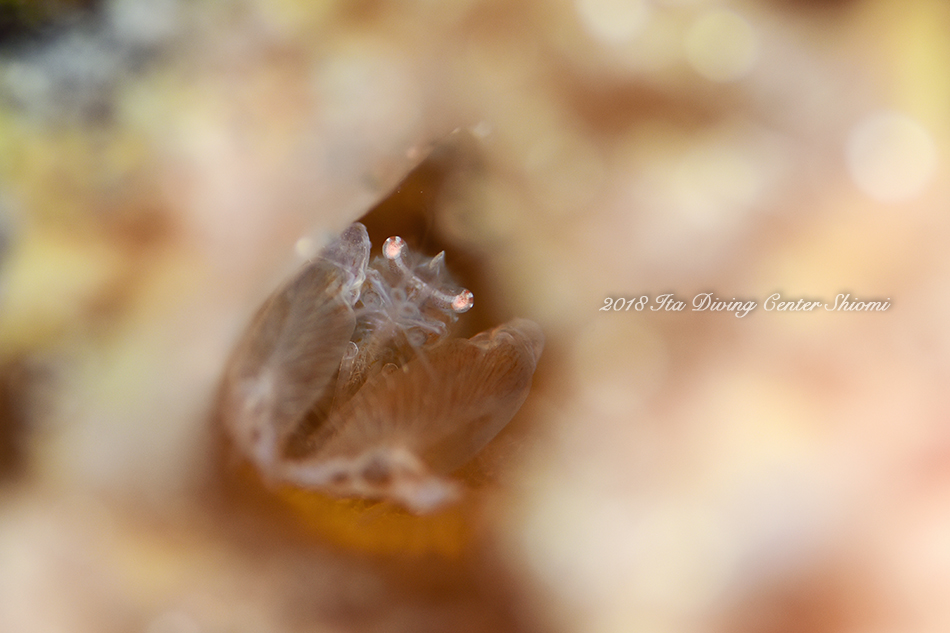 ストロボとライトを使用しての撮影。ストロボが上手く当たる角度で狙うとザラカイメンカクレエビの色も出る。