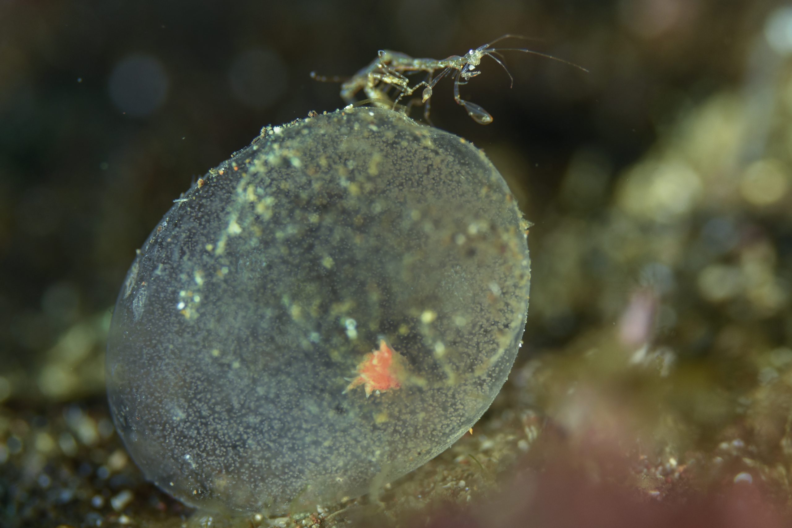 ゴカイの卵塊にピンクのトモエミノウミウシが♡