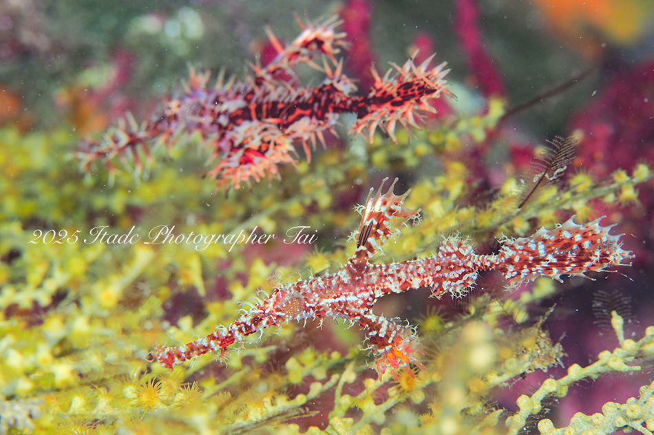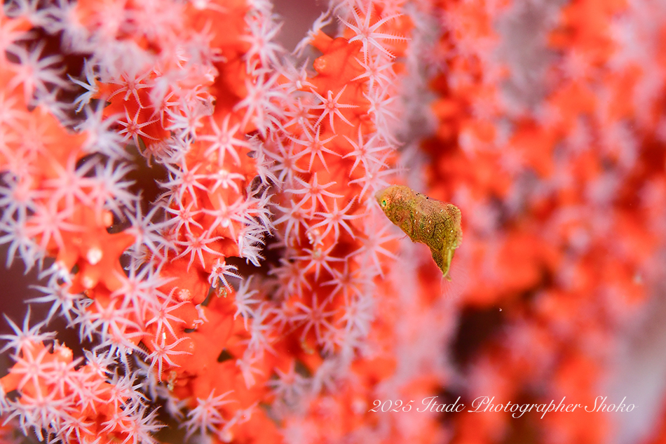 観察出来ている生物はミジンベニハゼのペア、ニシキフウライウオ、クダゴンベ、ヒレナガネジリンボウ、ネジリンボウ、スミレナガハナダイyg、ウミテング、ナンヨウツバメウオ、ホタルビオニハゼ、ヒメオニハゼ、シリウスベニハゼ、ケサガケベラyg、コガネスズメダイyg、ヒマワリスズメダイyg、ナノハナスズメダイyg、ハナゴイ、ホカケハナダイ、ニラミギンポ、ビシャモンエビ、クマノミ、イソギンチャクモエビ、カザリイソギンチャクエビなど観察出来ています。
