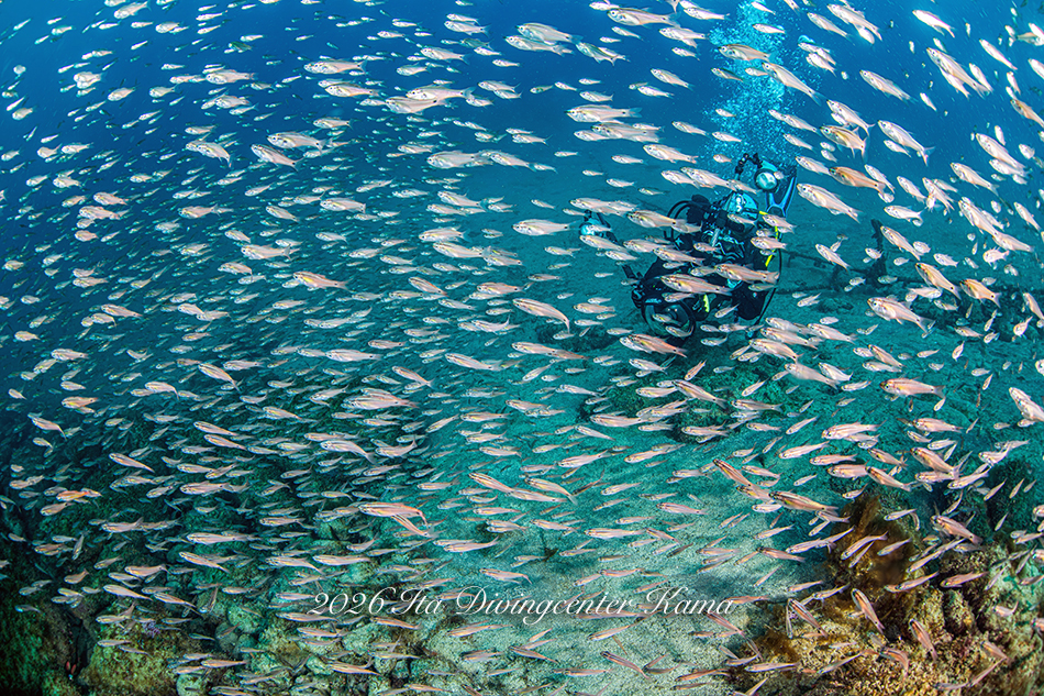 桟橋付近にはネンブツダイとクロホシイシモチの群れ。