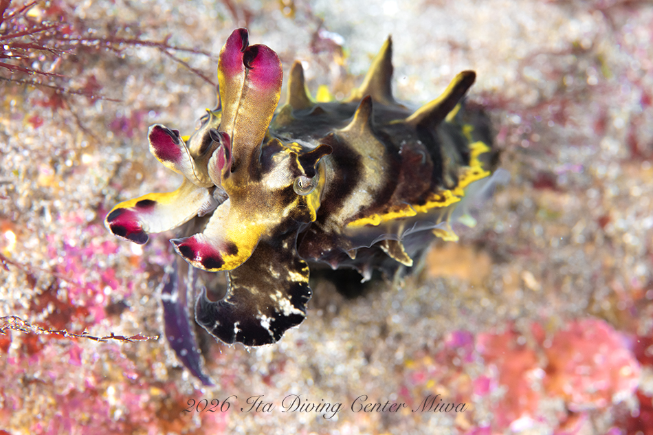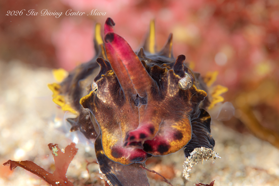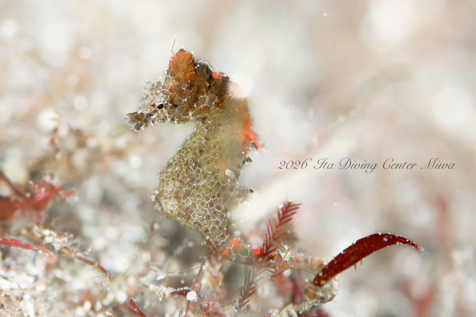 観察できている生物は、ハナイカ3個体、エナガカエルアンコウ、イロカエルアンコウ、ハチジョウタツ、クダゴンベ、ミジンベニハゼのペア、スベヨコエビSP、ホムラスベヨコエビ、イズオコゼ幼魚、マスダオコゼ幼魚、ツノヒメイカ、ハクセンアカホシカクレエビ、アカオビハナダイ、ナガハナダイ、ヤマドリ幼魚、ツノザヤウミウシ、タマガワコヤナギウミウシ、ツルガチゴミノウミウシ、ヒメエダウミウシ、アカズキンリュウグウウミウシ、コアカリュウグウウミウシ、コミドリリュウグウウミウシ、クマノミ、ムチカラマツエビ、ビシャモンエビなどです。