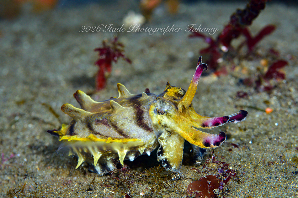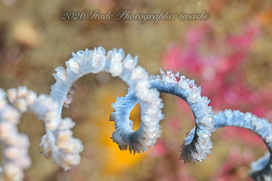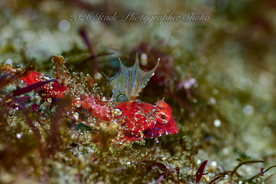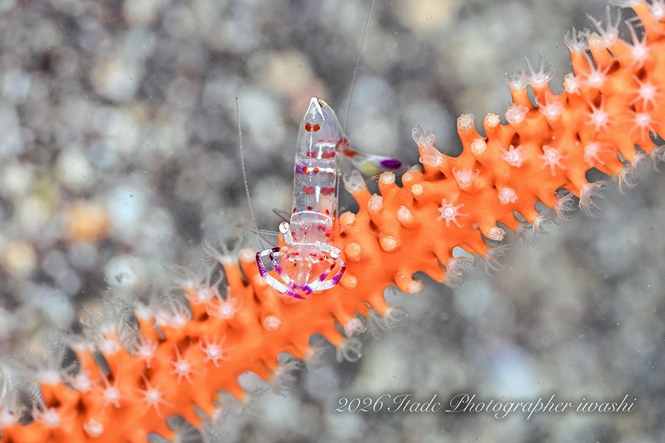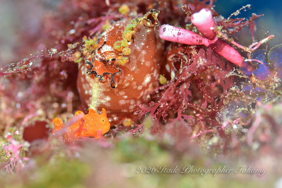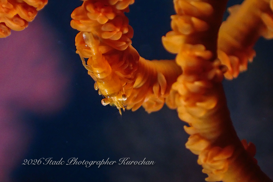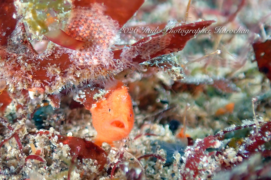 観察できている生物は、エナガカエルアンコウ幼魚×3、イロカエルアンコウ幼魚、ハチジョウタツ、クダゴンベ、ミジンベニハゼのペア、スベヨコエビSP、ホムラスベヨコエビ、イズオコゼ幼魚、マスダオコゼ幼魚、ツノヒメイカ、ハクセンアカホシカクレエビ、アカオビハナダイ、ナガハナダイ、ヤマドリ幼魚、オビアナハゼの卵、ツノザヤウミウシ、タマガワコヤナギウミウシ、ツルガチゴミノウミウシ、ヒメエダウミウシ、コアカリュウグウウミウシ、コミドリリュウグウウミウシ、クマノミ、ムチカラマツエビ、ビシャモンエビなどです。