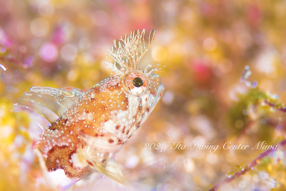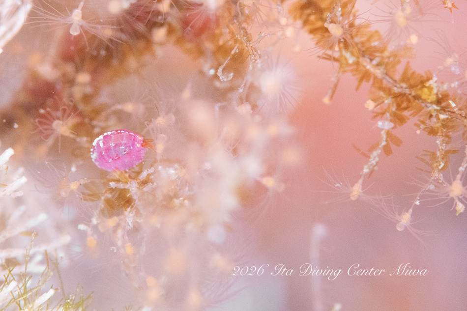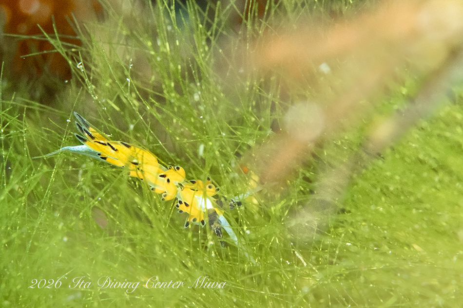 観察できている生物は、ハナイカ、エナガカエルアンコウ幼魚、イロカエルアンコウ幼魚、ハチジョウタツ、クダゴンベ、ミジンベニハゼのペア、スベヨコエビSP、ホムラスベヨコエビ、イズオコゼ幼魚、マスダオコゼ幼魚、ツノヒメイカ、ハクセンアカホシカクレエビ、アカオビハナダイ、ナガハナダイ、ヤマドリ幼魚、オビアナハゼの卵、ツノザヤウミウシ、タマガワコヤナギウミウシ、ツルガチゴミノウミウシ、ヒメエダウミウシ、コアカリュウグウウミウシ、コミドリリュウグウウミウシ、クマノミ、ムチカラマツエビ、ビシャモンエビなどです。