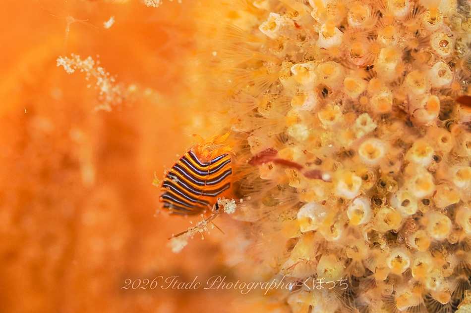観察できている生物は、ハチジョウタツ、ミジンベニハゼのペア、スベヨコエビSP、ホムラスベヨコエビ、アリモウミウシ、アカオビハナダイ、ナガハナダイ、サクラダイ、ヤマドリ幼魚、オビアナハゼの卵、クロモウミウシ、ヒメエダウミウシ、コミドリリュウグウウミウシ、クマノミ、ムチカラマツエビ、ビシャモンエビなど。