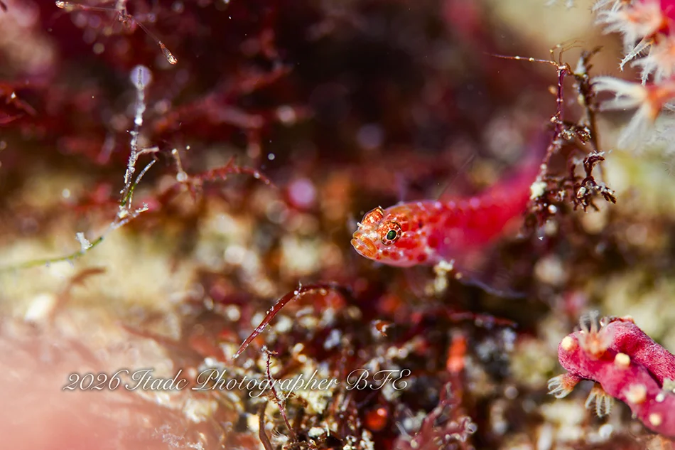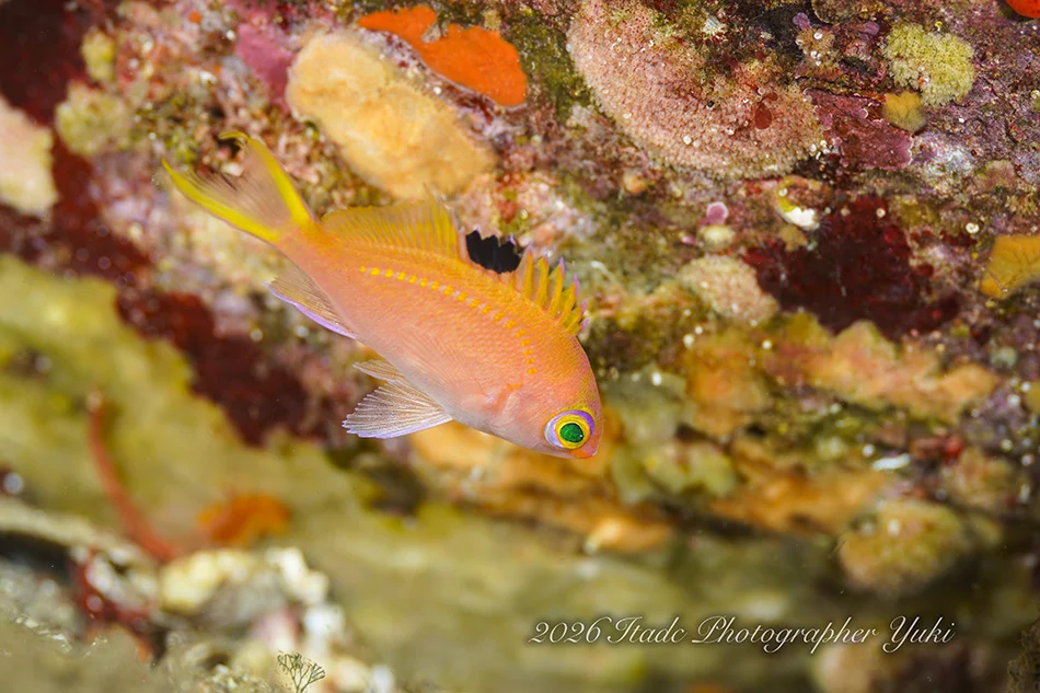 観察できている生物は、ハチジョウタツ、クダゴンベ、ミジンベニハゼのペア、スベヨコエビSP、ホムラスベヨコエビ、マツカサウオ幼魚、トウシマコケギンポ、ハクセンアカホシカクレエビ、アカオビハナダイ、ナガハナダイ、サクラダイ、ヤマドリ幼魚、タツノイトコ、クロモウミウシ、トヤマモウミウシ、アリモウミウシ、ミドリアマモウミウシ、ヒメエダウミウシ、コミドリリュウグウウミウシ、ムチカラマツエビ、ビシャモンエビ、ウミカラマツエビなど。