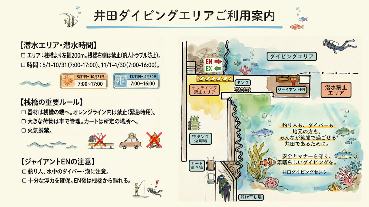 • 【重要】 桟橋下のロープより右側は釣り人専用エリアのため、水面・水中問わず立ち入り禁止です。(トラブル防止のため徹底をお願いします)
