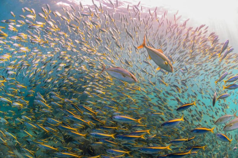 桟橋周辺には魚たちが群れていることが多いです。群れを追って潜水エリアを出ないように気を付けてください。釣りの仕掛けに引っかかると危険です!