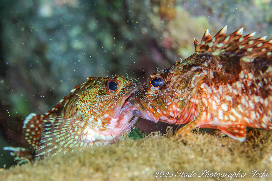 魚たちも増え、ゴロタ上ではアオヤガラやミノカサゴが小魚たちを捕食しようと狙っています。