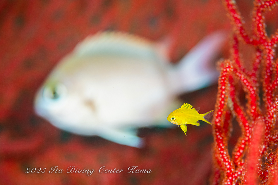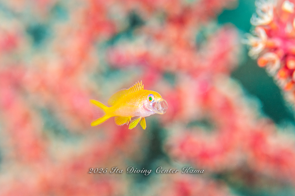 黄色いコガネスズメダイ達とピンクのアカオビハナダイ達が海を彩り華やかにしてくれています!