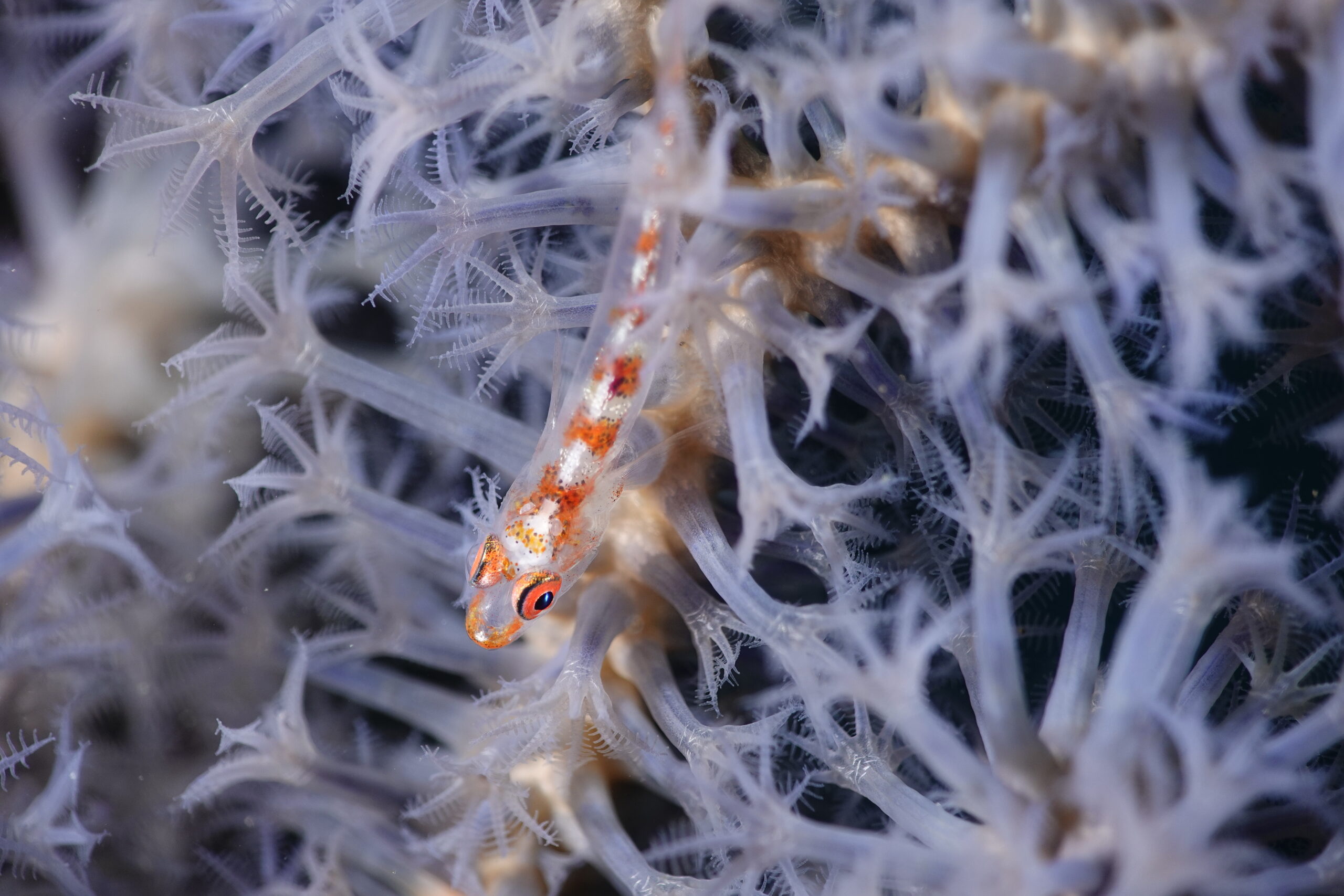 観察出来ている生物はミジンベニハゼのペア、ニシキフウライウオ、ホソフウライウオ、クダゴンベ幼魚、ヒレナガネジリンボウ、ヒレナガネジリンボウ幼魚、ネジリンボウ幼魚、シリウスベニハゼ、オオメハゼ、マルハナシャコ、ウミテング幼魚、ナンヨウツバメウオ、ホタルビオニハゼのペア、ヒメオニハゼ、セダカスズメダイ幼魚、コガネスズメダイ幼魚、ヒマワリスズメダイ幼魚、ナノハナスズメダイ幼魚、ヤマドリ幼魚、タツノイトコ幼魚、ビシャモンエビ、クマノミ、イソギンチャクモエビ、カザリイソギンチャクエビ、クロフチススキベラ幼魚、コガネキュウセン幼魚、テンス幼魚、ホシテンス幼魚、アライソコケギンポ、トウシマコケギンポ、セスジミノウミウシなど。