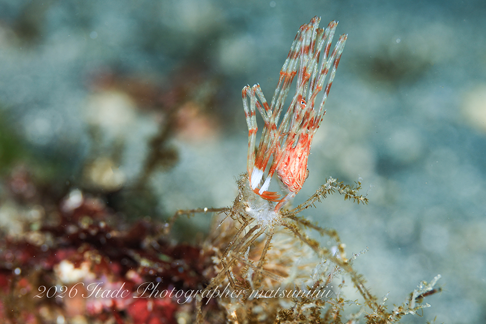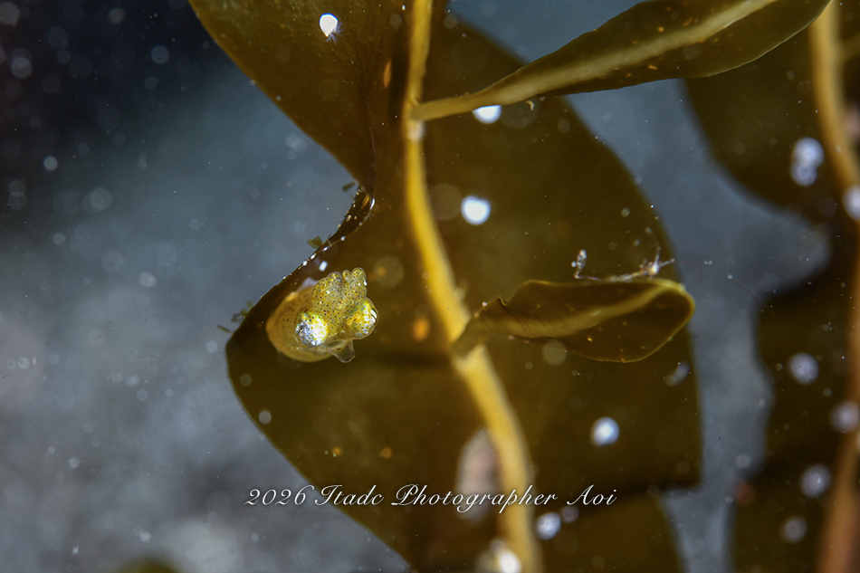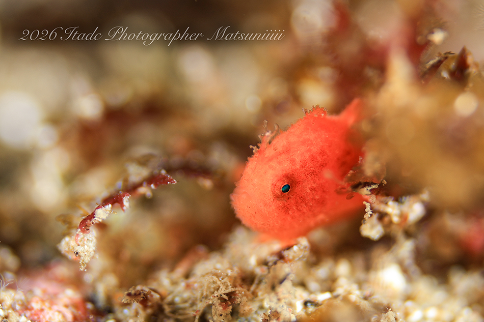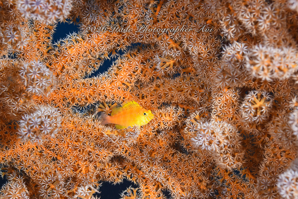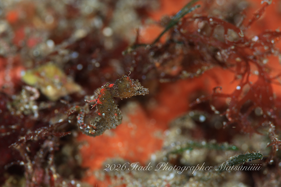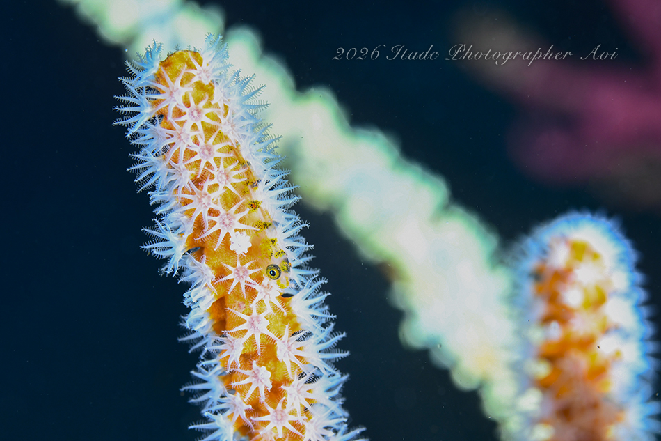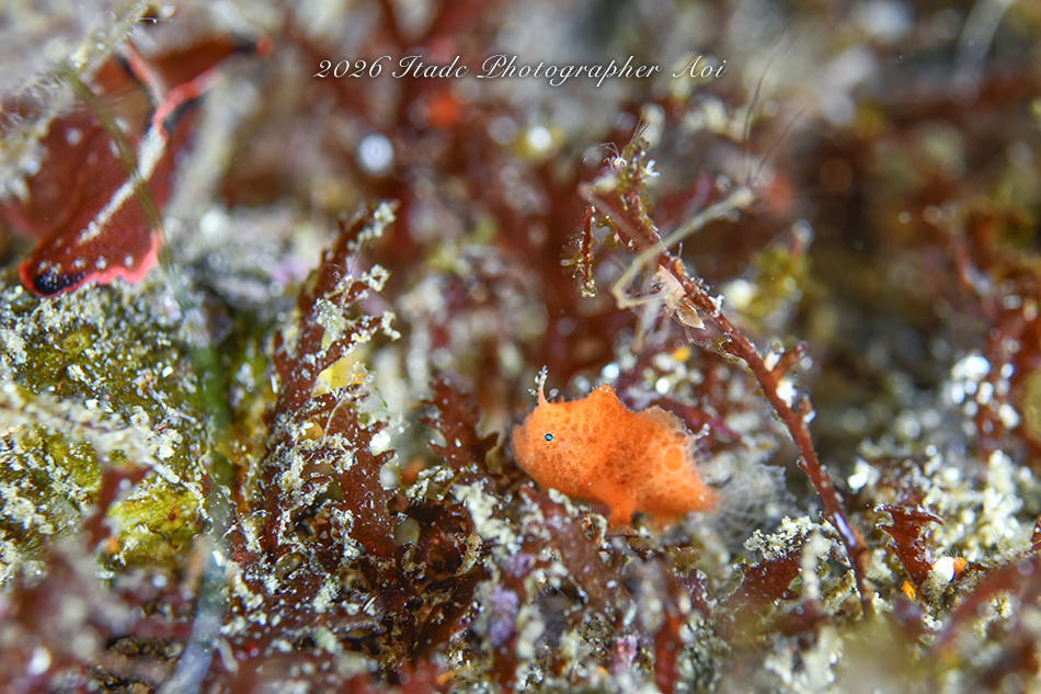 観察できている生物は、エナガカエルアンコウ幼魚×3、イロカエルアンコウ幼魚、ハチジョウタツ、クダゴンベ、ミジンベニハゼのペア、スベヨコエビSP、ホムラスベヨコエビ、イズオコゼ幼魚、マスダオコゼ幼魚、ツノヒメイカ、ハクセンアカホシカクレエビ、アカオビハナダイ、ナガハナダイ、ヤマドリ幼魚、オビアナハゼの卵、ツノザヤウミウシ、タマガワコヤナギウミウシ、ツルガチゴミノウミウシ、ヒメエダウミウシ、コアカリュウグウウミウシ、コミドリリュウグウウミウシ、クマノミ、ムチカラマツエビ、ビシャモンエビなどです。